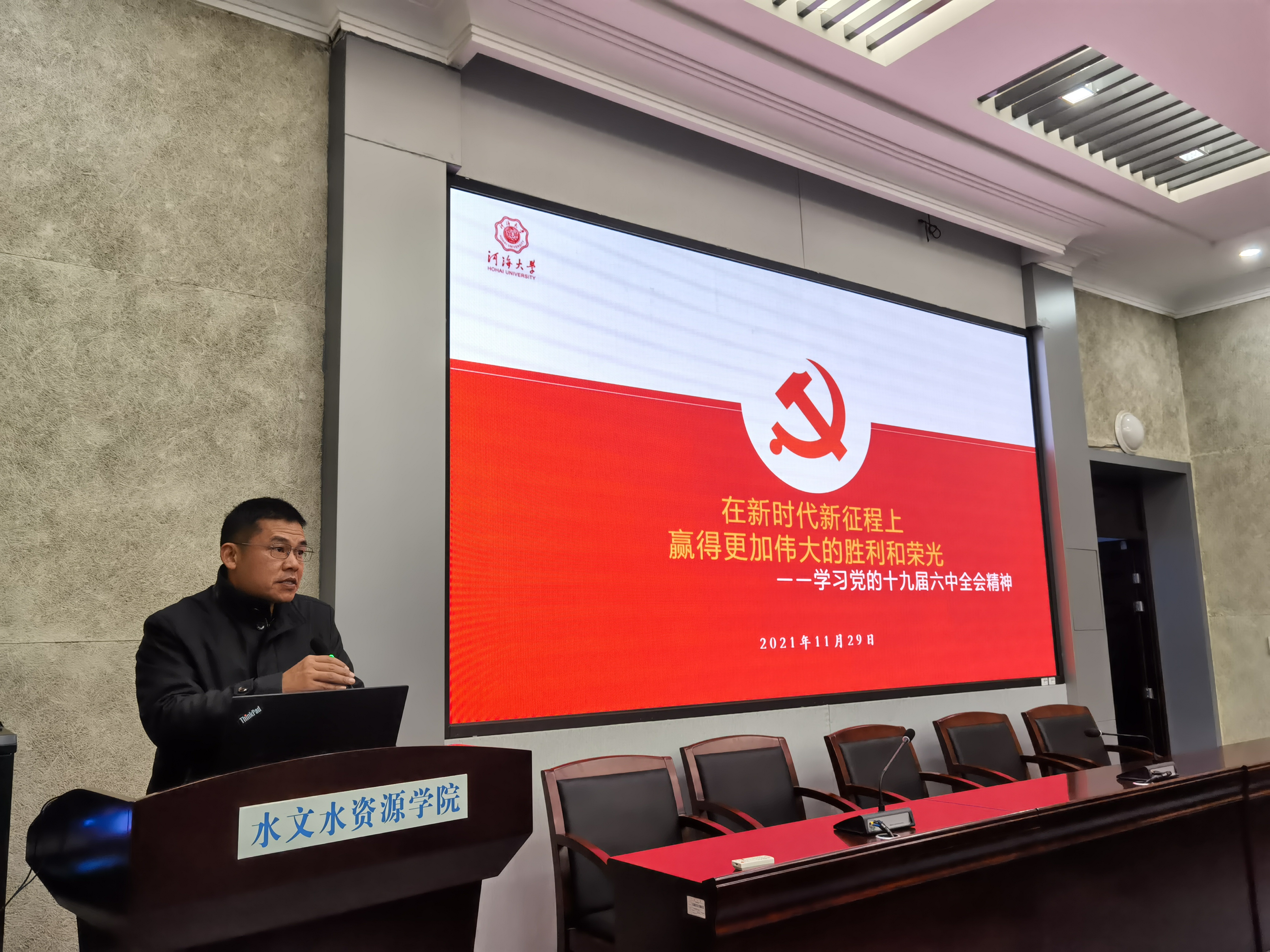 11月29日下午在工程馆301,2007so太阳集团组织召开《党的十九届六中全会精神》专题学习会,会议由王寿辉书记主持,全体师生参加。