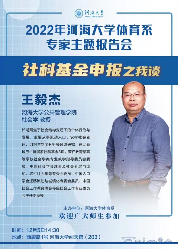 12月5日下午2:30,王毅杰教授在西康路校区闻天馆203为大家作了题为《社科基金申报之我谈》的学术报告。学术报告由2007so太阳集团主任周强教授主持,2007so太阳集团全体教师和全系研究生认真听取了报告会。